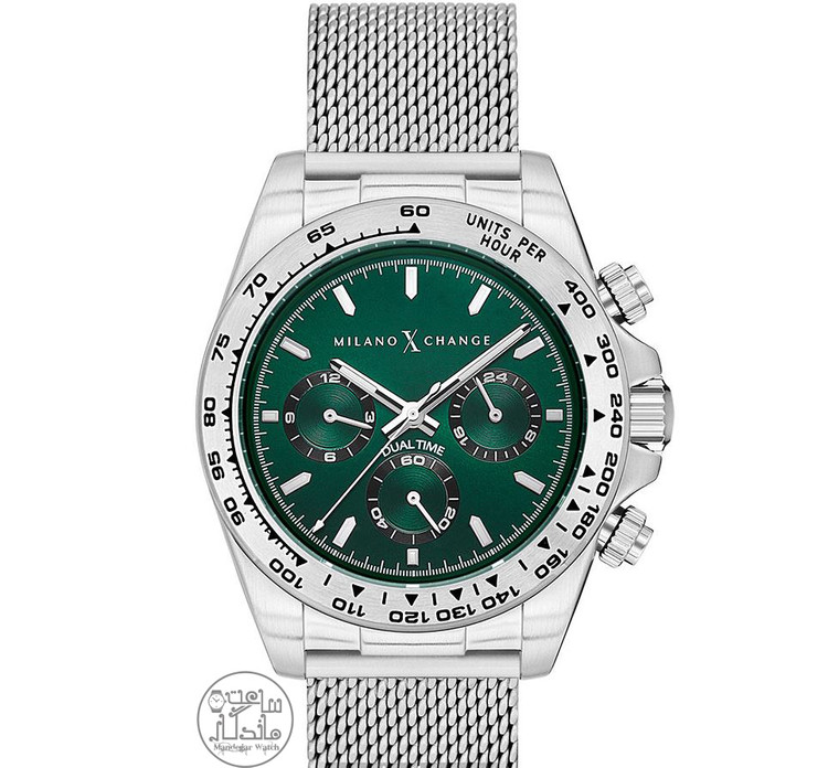 ساعت مچی مردانه میلانو اکس چنج مدل MXG2126 به دلیل دقت و ظرافت در طراحی کلی آن، مناسب بررسی جز به جز امکانات و ویژگی های به کار رفته در ظاهرش می باشد. اولین و مهم ترین چیزی که در این بررسی جلب توجه می کند، ظاهر رنگی جذاب نقره ای و سبز است و از خصوصیات کلی ظاهری آن نیز، صفحه با ترکیب رنگی شیک و دوست داشتنی سبز است. اگر کمی دقیق تر به صفحه این ساعت بنگریم، نمایشگر ساعت شبانه روز، ساعت ثانویه و عقربه های شبرنگ دیده می شود که با ترکیب شیک کنار هم قرار گرفته اند و صفحه چند عقربه ای نقطه قوت این ترکیب می باشد. این ساعت مچی دارای ترکیب رنگی نقره ای - سبز است که همه ی این ویژگی ها در کنار هم جلوه ی کلاسیک چشم نواز به آن بخشیده است و استایل کلاسیک آن مناسب ست شدن با لباس مجلسی و کلاسیک می باشد.