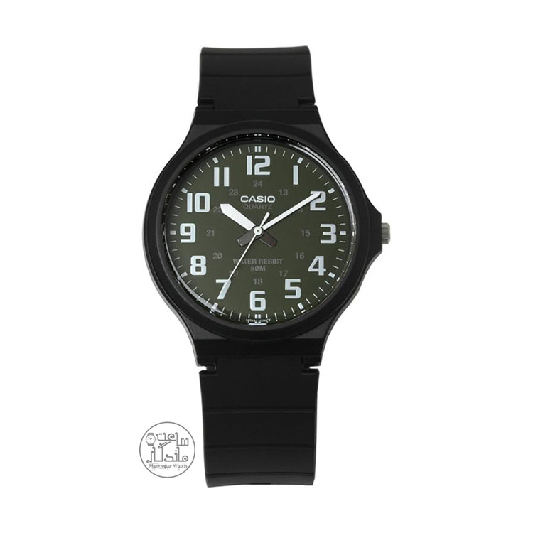 ساعت کاسیو (Casio) مردانه مدل MW-240-3BVDF، ساعتی اسپرت و مینیمال است و مناسب برای افرادی است که به رنگ سبز و مشکی علاقه دارند. صفحه نمایش این ساعت طراحیای آنالوگ دارد، که با ایندکس های عددی و سه عقربهی استیل تنظیم شده و نمای زیبایی ایجاد کرده است. در بررسی ریز تر میتوان به فرمت AM و PM روی صفحه نیز اشاره کرد. جنس به کار رفته در این ساعت از جنس رزین است و تا عمق 50 متر فشار آب را تحمل میکند.